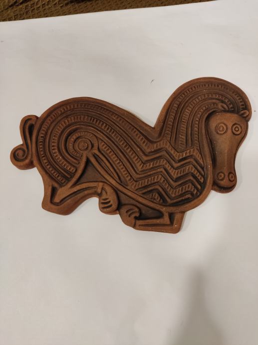 KONJIć od terakote, replika, pečat Biskupije KNIN-SPLIT , VII stoljeće. Dužina 20 cm, visina u području glave 15 cm. Može se objesiti na zid.