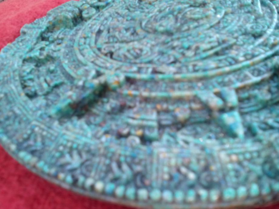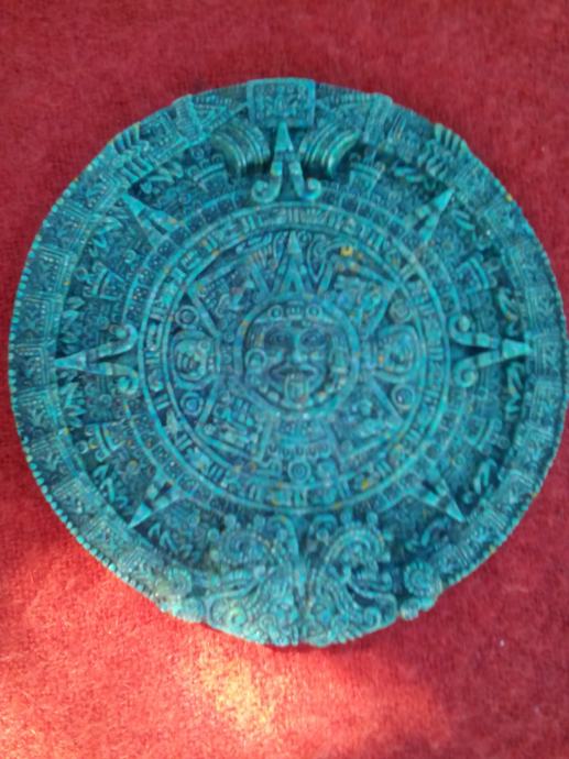 Majanski kalendar ili ga jos neki zovu horoskop iz Mexica iz razdoblja 70 ih godina proslog stoljeca.Promjera je 18 cm..reljefan..vrlo lijep.Pogodan za ljubitelje mayanske kulture ili kao ukras...Sama doprema eksponate iz Mexica i to prije 40 godina cini ga jos posebnijim..zg