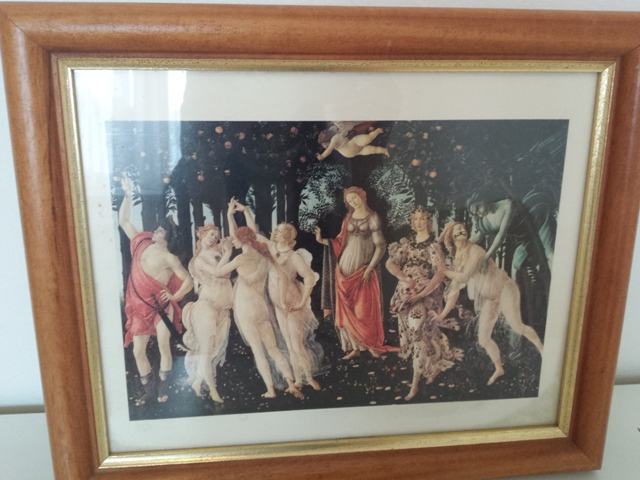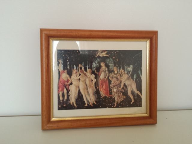 Uokvirena slika replika Botticelli-Alegorija proljeća, u drvenom okviru.