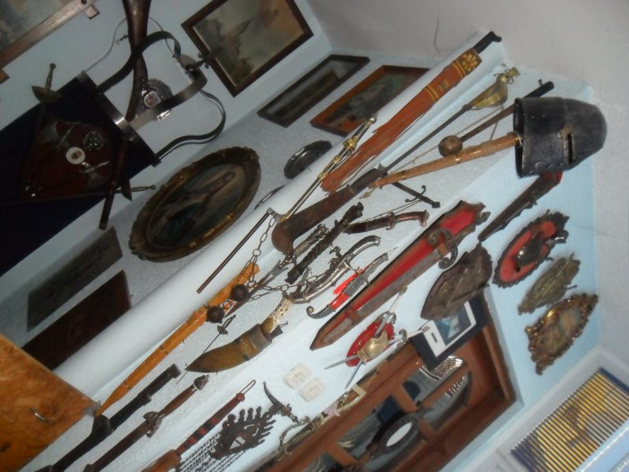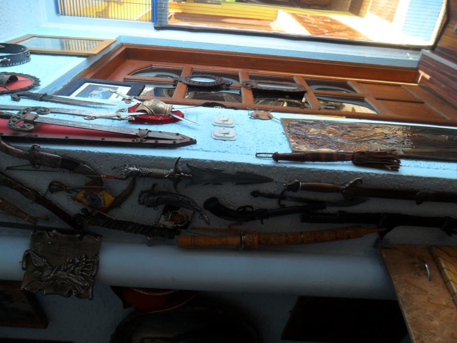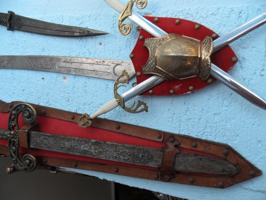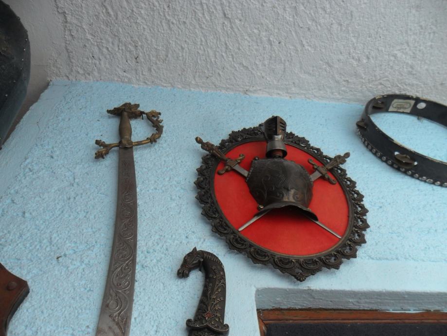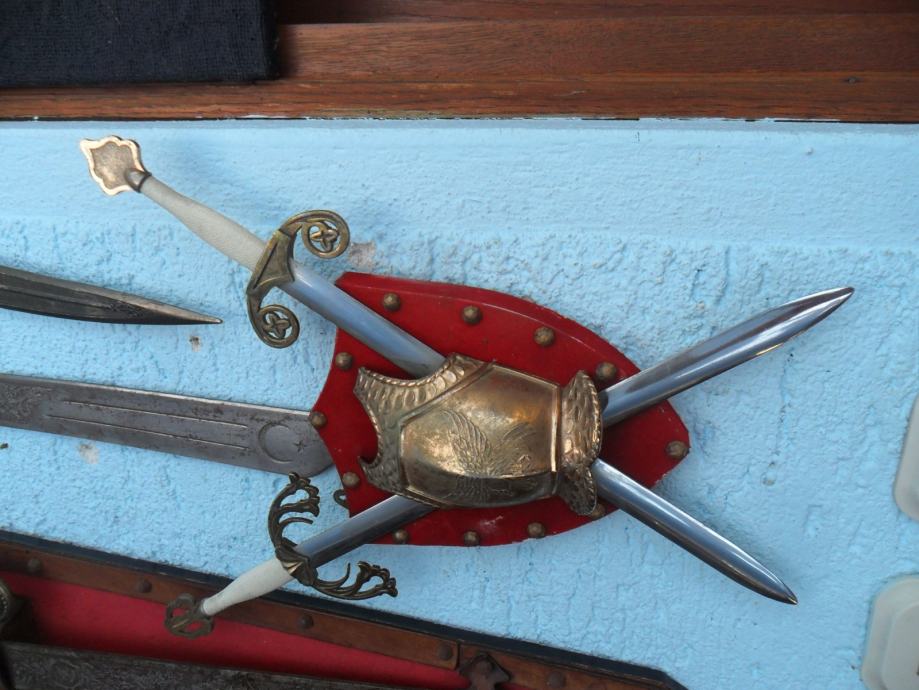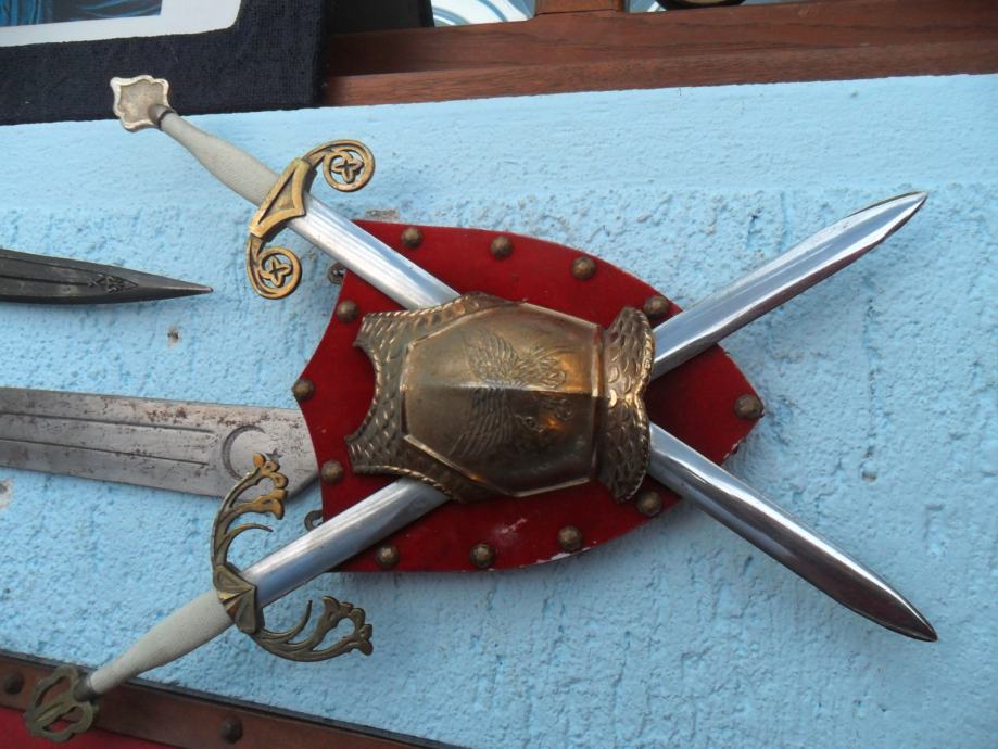 prekrasan suvenir na zidu,,mačevi su od metala,prsni štit od metala,postolje presvučeno sa crvenim plišom koji je zakucan bakrenim klinovima,u posjedu oko 20 godina...dimenzije su dužina samog mača 44cm,,,cijeli komplet je 30 x 35 x 7cm(širina x visina x debljina),imam još jednu sličnu garnituru(vidi slike).....navedena cijena nije fixna i uvid je u zamjene