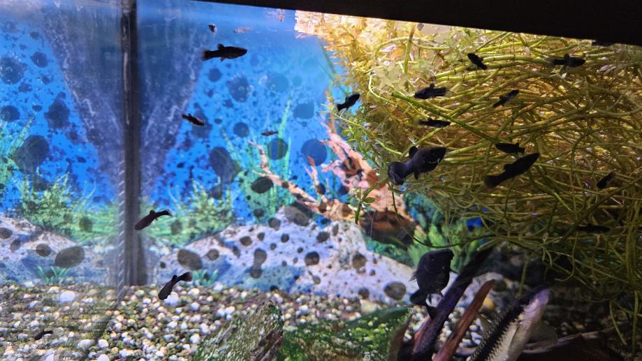 Slatkovodne crne ribice Molly, mlade veličine 1,5 do 2 cm.... Narastu max od 5 do 9 cm.