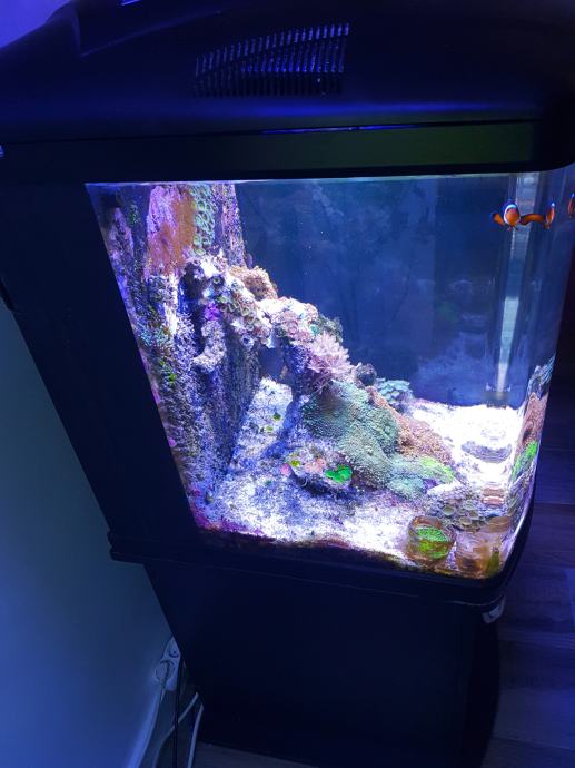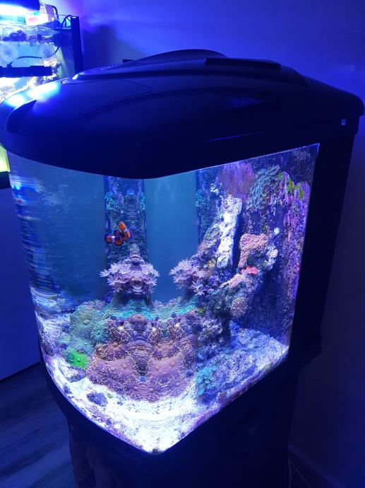 - Akvarij zapremine 128 litara s pregradnim filterom u kojem se nalaze grijač, povratna pumpa (1000l/h), filtracijski materijal i živi kamen. U pregradnom filteru ima komora za manji skimer tipa Tunze Comline DOC ili Bubble-magnus miniQ ukoliko neko želi da ima i skimer.