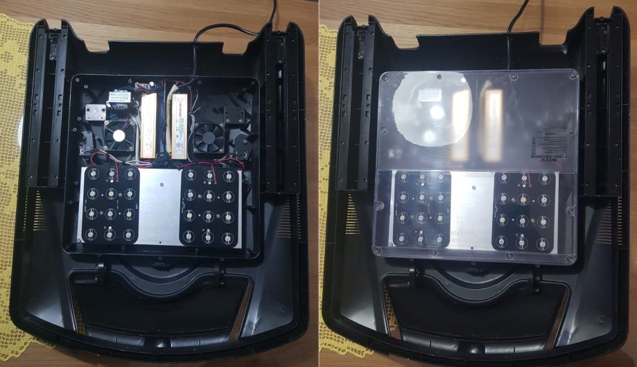 - Originalni plastični poklopac u kome se nalaze dva LED modula (svaki je 12x3W LED sa zasebim napajanjem) s velikim hladnjakom i dva ventilatora. Na poklopcu je i prekidač za paljenje rasvjete. Ukupna snaga svjetla je 72W što je više dovoljno za mekane i LPS koralje.