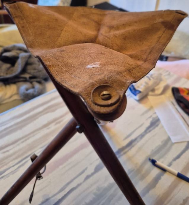 Drveni ribički stolac na rasklapanje. Sjedište je izrađeno od kože.