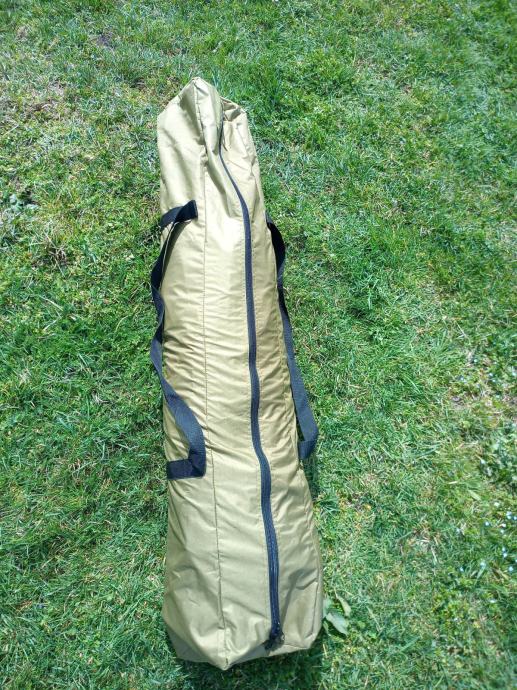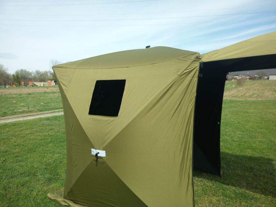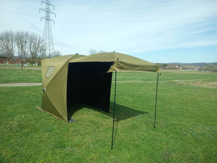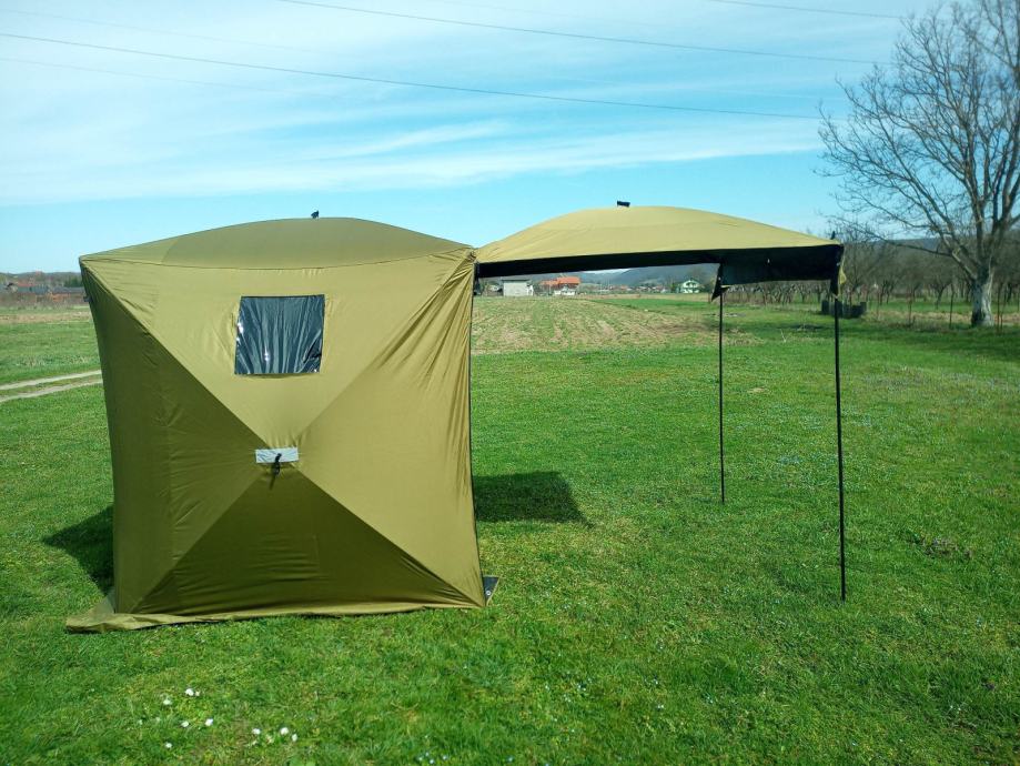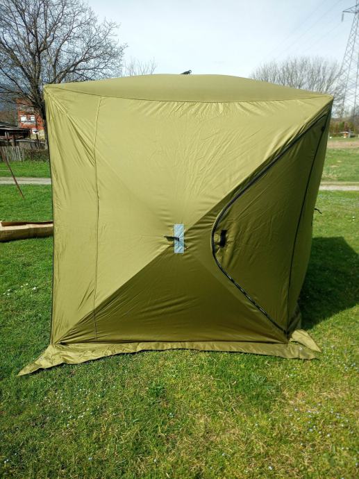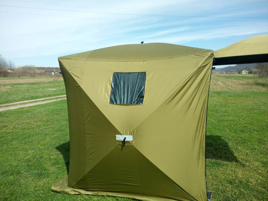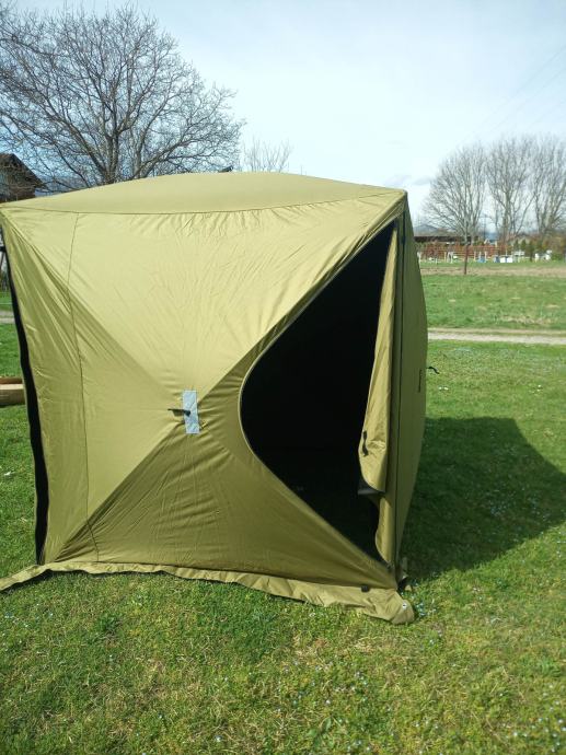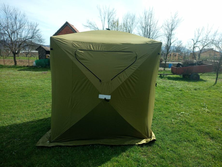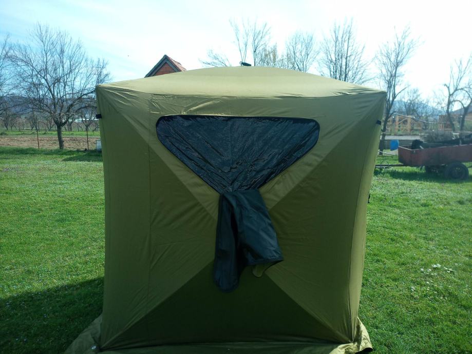 Inovativni Pop UP šator, koji se može podići za nekoliko sekundi. Upečatljiva, a istovremeno praktična su velika vrata, koja se po potrebi mogu podići i fiksirati pomoću 2 stupa te tako služe i kao nadstrešnica. Praktični prozori na bočnim i stražnjim stranama mogu se djelomično otvoriti i opremljeni su mrežama protiv komaraca. Vodeni stupac: 10 000 mm. Dimenzije: 180 x 180 x 205 cm. Transportna dimenzija: 135 cm.Šator je nov nekorišten sklopljen za slikanje