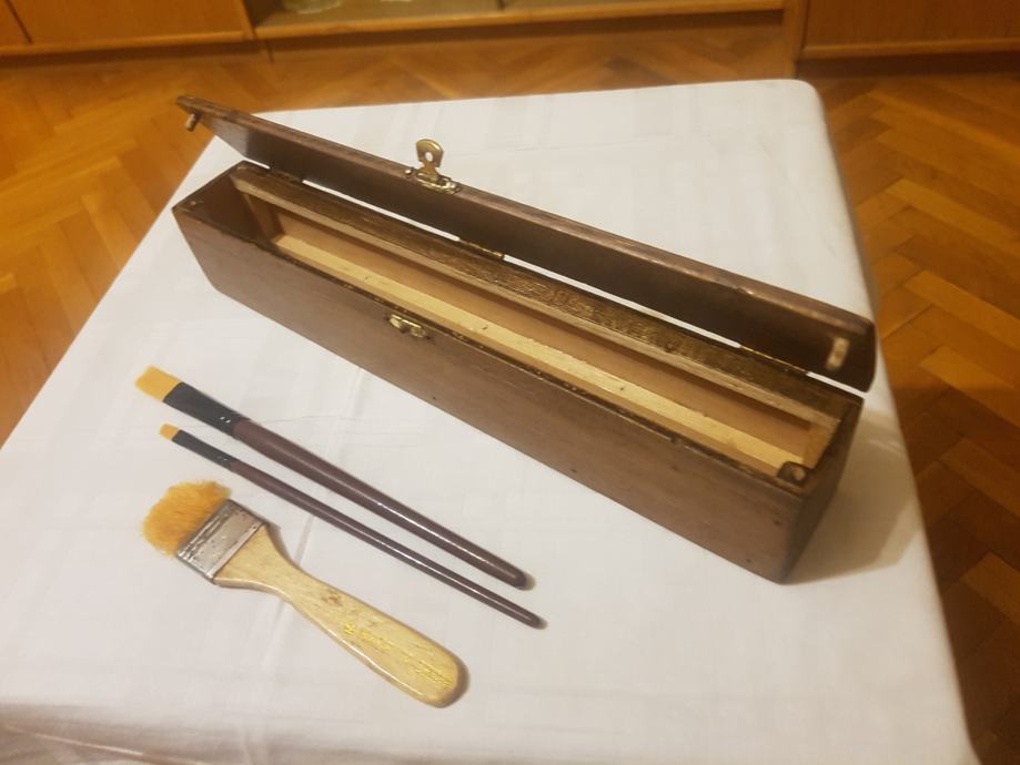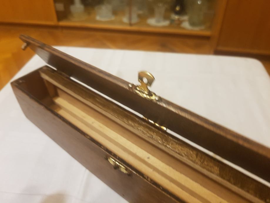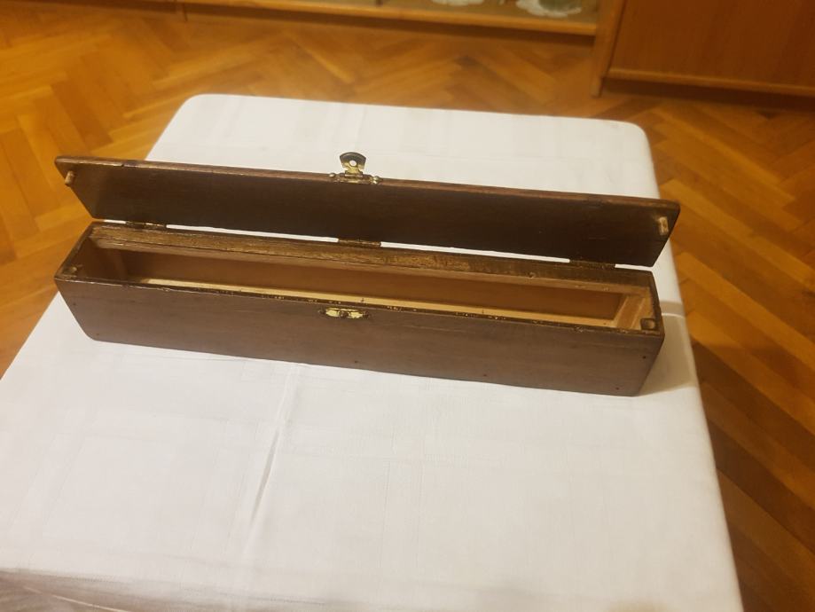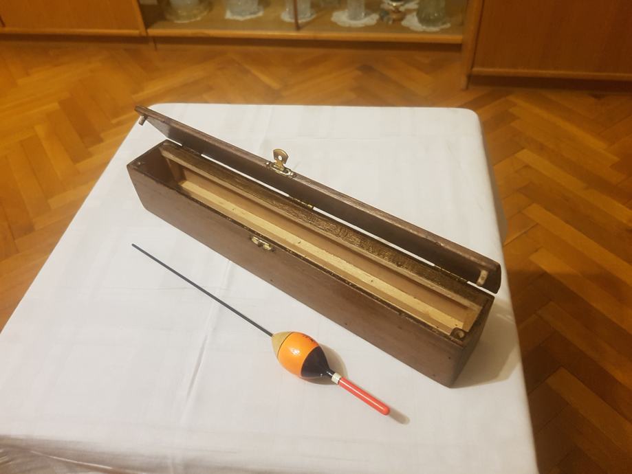 KUTIJA DRVENA ZA PLOVKE, DIM. L x H x D = 300 x 55 x 45 mm, SMEĐE PAJCANA, POLAKIRANA, 3 PANTA, KOPČA. RUČNI RAD.