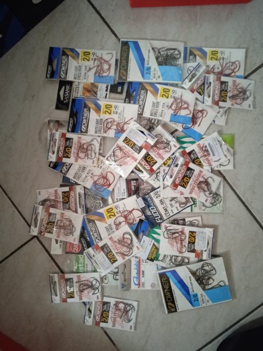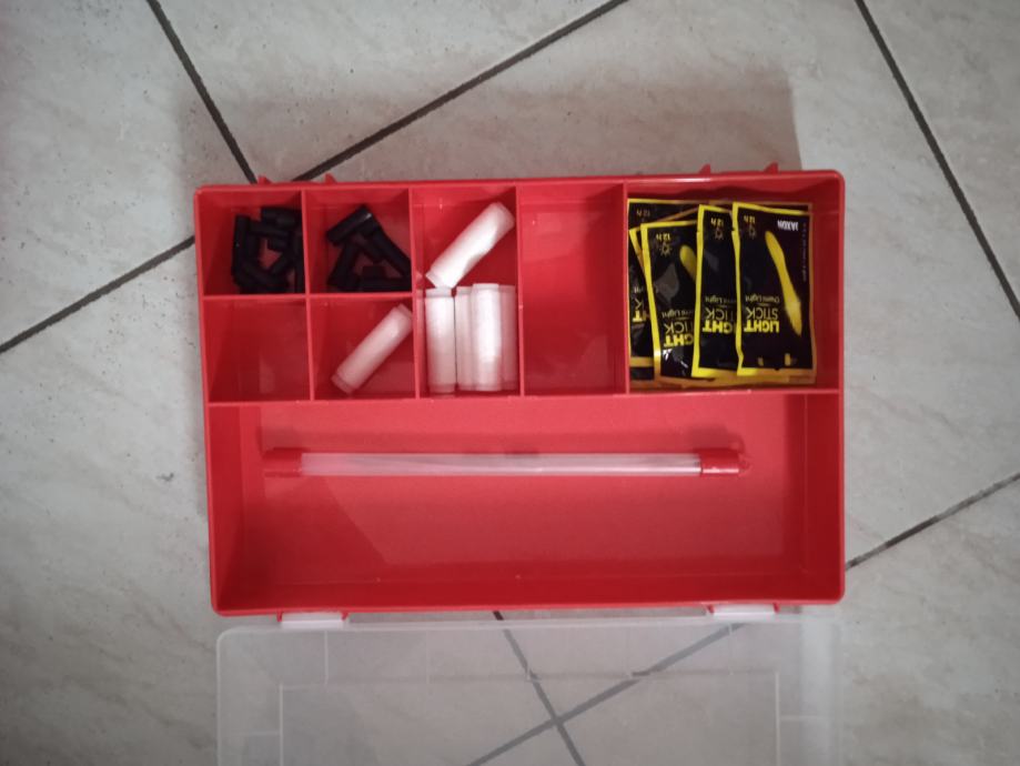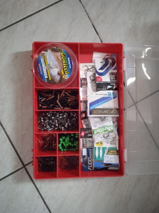 i brdo sitnog pribora: udice, olova, zogulini, T vrtilice, stonfo klizaci za olovo, perle, tubertini fluoro, filo elastico, igle za crve, starlete, nosaći za starlete...