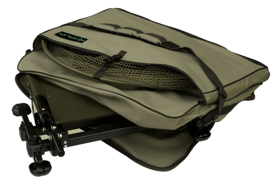 TORBA; Designed to transport chair and nets in an easy to manage bag. Chairs fit sideways increasing ground clearance and making them easier to carry. Front pocket is large enough for landing nets, keepnets and unhooking mats