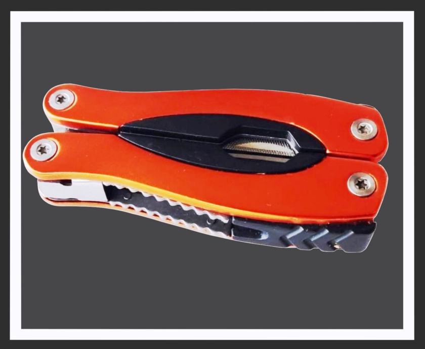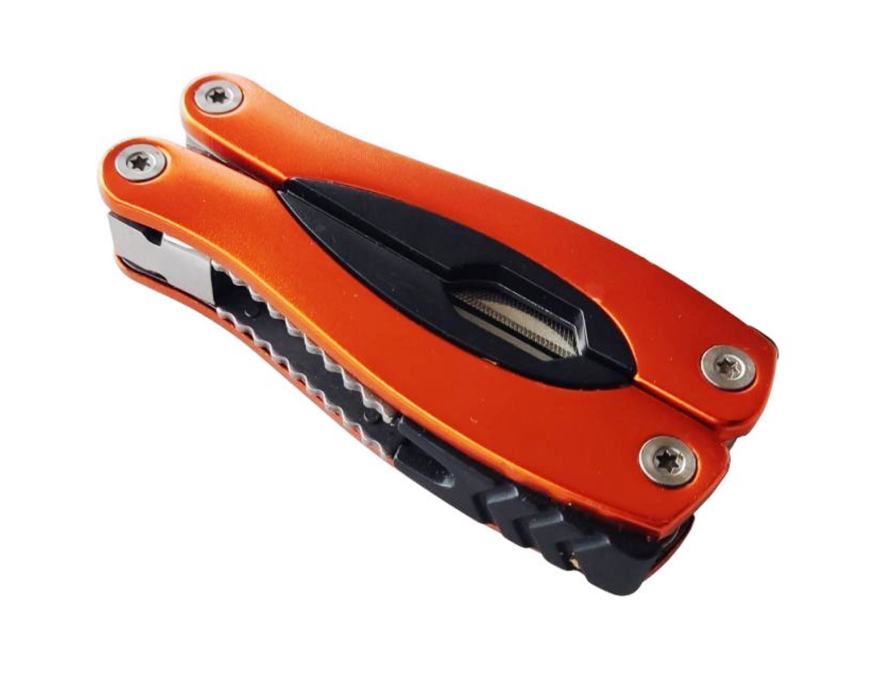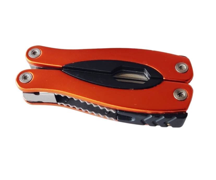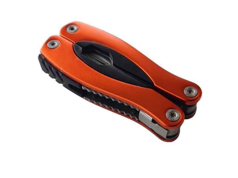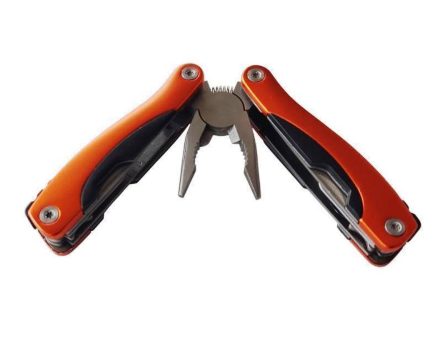 Posjeduje više funkcija: kliješta, veliki nož ( 70 mm), turpija, odvijač ravni manji, odvijač ravni veći, otvarač za boce, otvarač za konzerve, odvijač križni, pila, nož za čistiti ribu, oznake u inchima i cm...