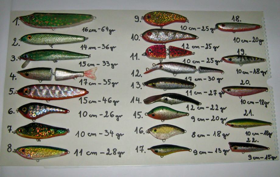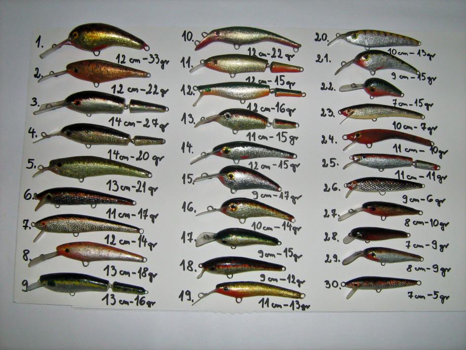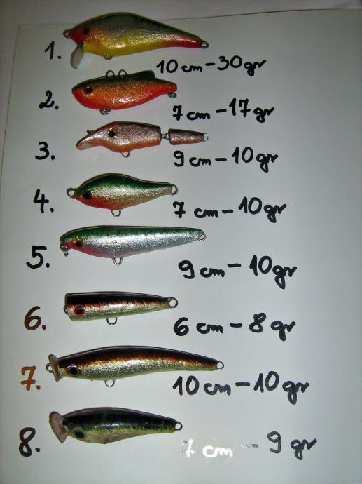 Voblere i njihovu težinu/dužinu možete vidjeti na priloženim slikama. To su najčešći modeli koje radim. Svaki komad je individualno testiran na vodi i u mini bazenima; modeli isprobani u ribolovu.