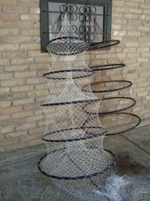 Vrška sa jednim krilom 50, 75, 100 oka i dva krila, prednji obruč 70 cm, 80 cm, 90 cm, 100 cm i 120 cm, oka 3 cm do 5 cm, te senkeri.