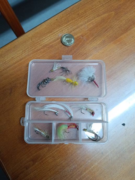 Prodajem u lotu s kutijicom 10 kom.mušica kozja dlaka,perje,za bucova i salmonide.