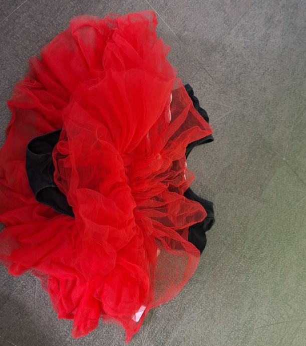 Dres Minnie Mouse za ritmiku i ples, triko za djevojčice, 110 /116, triko je crni kratkih rukava i iznad crvena tutu haljinica s bijelim tufnama - sve u komadu.