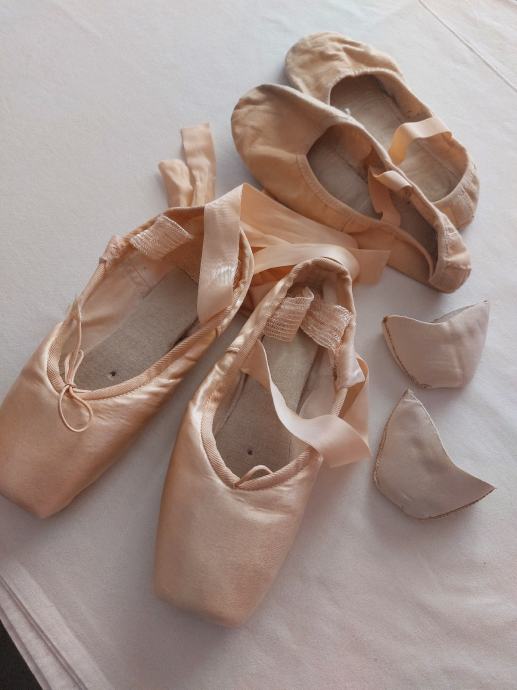 Za nogu velicine 36. Uz njih poklanjam 2 para baletnih papucica br 33 i 36, više suknjica od tila, donji dio trenerke, rozu torbu za trening i razne dodatke...