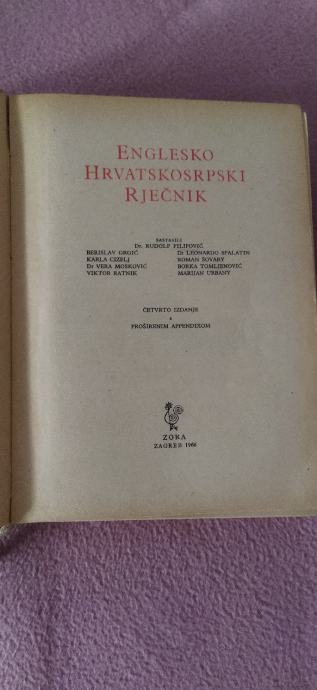 Veliki rječnik, sastavili 1966.g.Rudolf Filipović i dr.,ima 1467 stranica.Malo oštećen hrbat,treba ga zalijepiti,drugo na broju