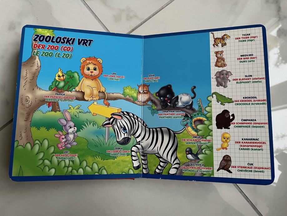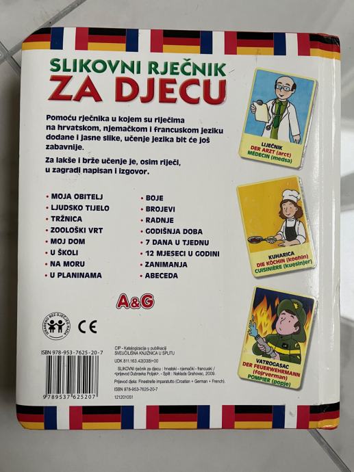 Pomoću rječnika u kojem su riječima na hrvatskom, njemačkom i francuskom jeziku dodane i jasne slike, učenje jezika bit će još zabavnije. Za lakše učenje jezika u rječniku je napisan izgovor riječi. Teme koje se obrađuju: moja obitelj, ljudsko tijelo, tržnica, zoološki vrt, moj dom, u školi, na moru, u planinama, boje, brojevi, radnje, godišnja doba, 7 dana u tjednu, 12 mjeseci u godini, zanimanja, abeceda.
