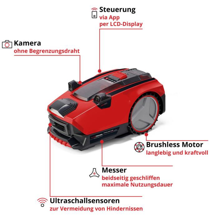 Einhell robotska kosilica FREELEXO CAM PLUS 600 pripada snažnoj obitelji Power X-Change, koja pruža neograničenu fleksibilnost unutar obitelji. Litij-ionske baterije iz sistema mogu se kombinirati sa svim uređajima iz sistema. Koristeći integriranu kameru, FREELEXO CAM PLUS 600 automatski prepoznaje granice travnjaka koje treba kositi percipiranjem travnjaka na temelju boja i struktura. Fizičke granice, kao što su zidovi, živice ili drveće, prepoznaju integrirani ultrazvučni senzori, dok kamera bilježi optičke granice kao što su malč od kore, katran i kamenje. To vam štedi dugotrajno i naporno postavljanje granične žice, a robotska kosilica može odmah započeti s radom. Zahvaljujući kameri, robotska kosilica može detektirati različite površine, a pomoću senzora za udarce i prepreke može detektirati i prepreke veće od 10 cm. 5 metara duga magnetska traka uključena u isporuku također služi kao virtualna granica za robotsku kosilicu nakon što je postavljena u vrtu. Magnetski senzori u FREELEXO CAM PLUS 600 detektiraju magnetsku traku tako da se robotska kosilica gasi na rubu trake. To znači da se područja koja se ne žele kositi mogu ograničiti pomoću magnetske trake, na primjer svježe posađeno drvo ili cvjetna livada. FREELEXO CAM PLUS 600 se može koristiti putem WiFi-a s aplikacijom Einhell Connect ili putem LCD zaslona s intuitivnom tipkovnicom. Na primjer, vremena košnje mogu se programirati na točan dan. Kako bi se osiguralo da robotska kosilica uvijek bude ažurna, ažuriranja se provode "bežično", tj. putem WLAN-a bez dodatnog USB sticka. Robotska kosilica zaštićena je od krađe PIN kodom i signalom upozorenja. Povratak na stanicu za punjenje i proces punjenja odvija se automatski. Integriran je i senzor za kišu. Robotska kosilica ima podešavanje visine rezanja od 20 mm do 60 mm i prikladna je za nagibe do 25%. Ručka za nošenje osigurava udoban transport. FREELEXO CAM PLUS 600 dolazi sa svime što je potrebno za instalaciju i rad. Namijenjen je za travnjak površine do 600 m².