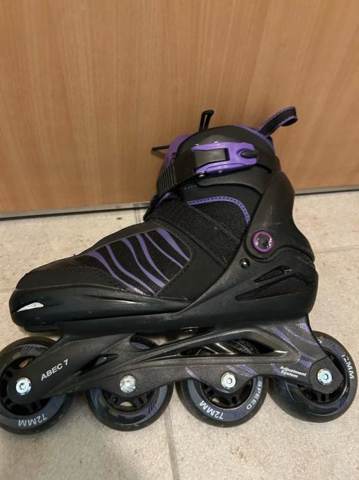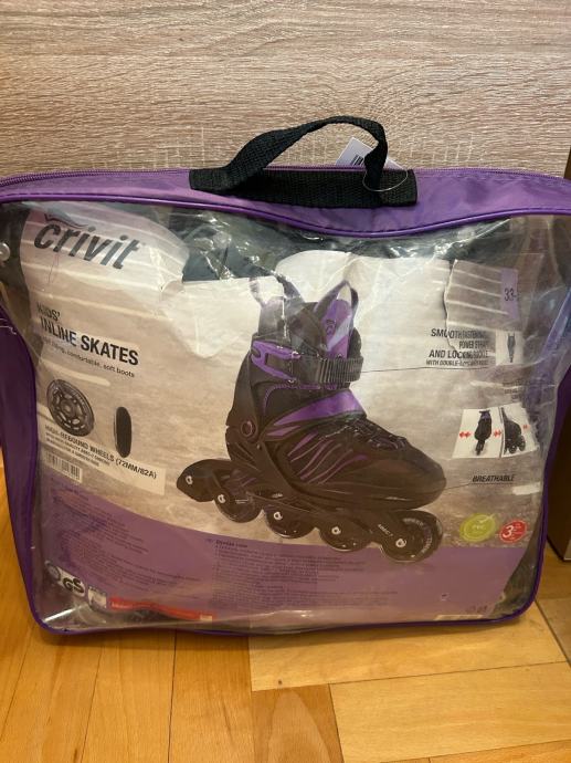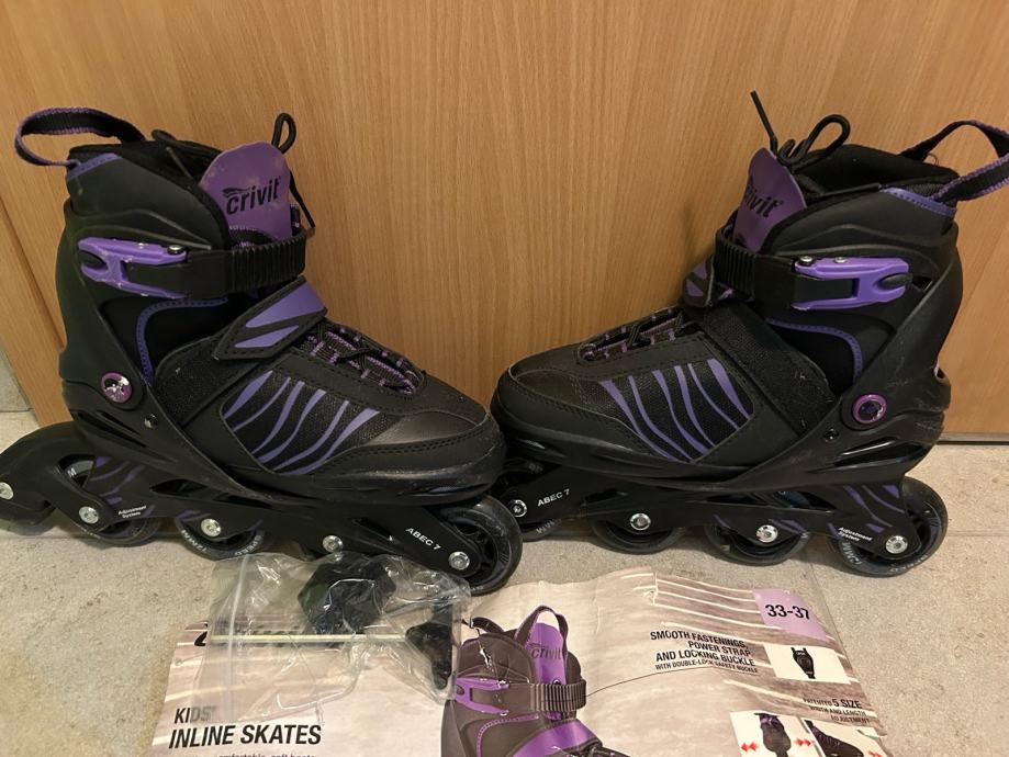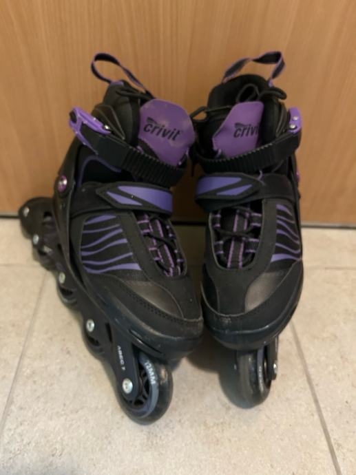 Prodajem dječje inline role marke Crivit, crne boje s ljubičastim detaljima. Veličina je podesiva u rasponu od 33 do 37, što ih čini praktičnima jer prate rast djeteta. Role imaju 4 gumena kotača promjera 72 mm s ABEC 7 ležajevima.