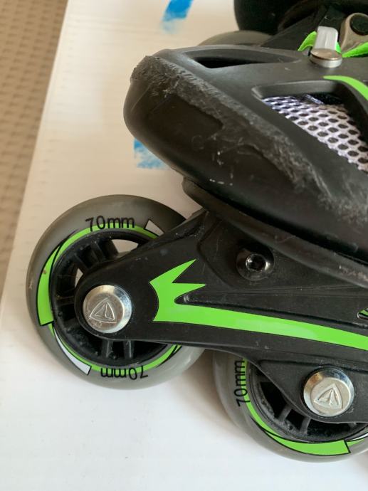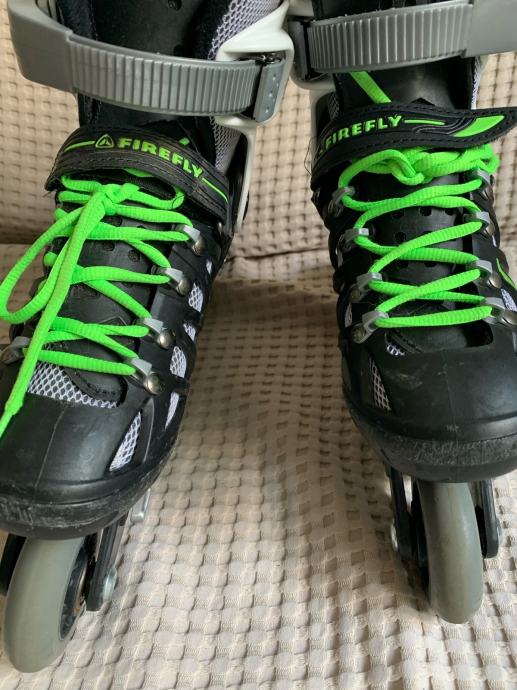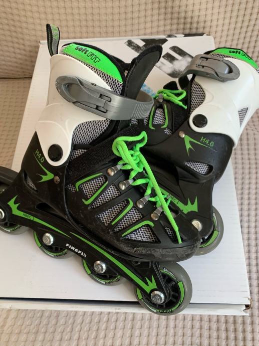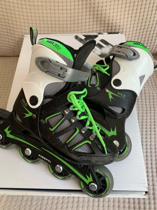 Prodajem malo koristene role marke Fireflu, kupljene u Intersportu. Silikonski kotaci, ABEC1, 70 mm, tvrdoca 80A. Zaista malo vozene od strane moje djevojcice. Odlicne za pocetnike. Funkcionalne nove sto se tice kotaca, mehanizama, kocnice... to je super ocuvano i kao novo, jedino sto su neminovni padovi na asfaltu malcice ostavili traga ( na slici). Placene 299 kn.