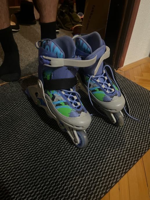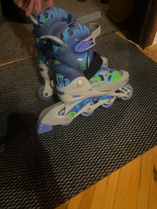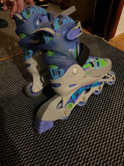 Prodajem rabljene dječje role u plavo-zelenoj boji s prilagodljivim čičak zatvaračem. Role su korištene ali u dobrom stanju, idealne za početnike. Udoban unutarnji dio osigurava ugodan osjećaj tijekom vožnje. Role imaju prilagodljivu vrličinu 30-33.