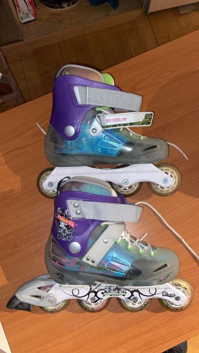 Prodajem rabljene inline role Rollerblade Fusion X3. Radi se o popularnom modelu poznate marke Rollerblade, pogodnom za rekreativno rolanje. Role su ljubičasto-sive boje s prozirnim elementima i ukupno četiri kotača po roli.
