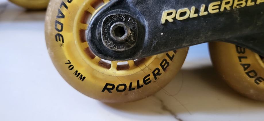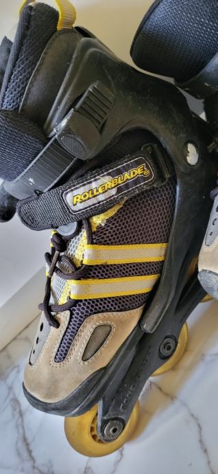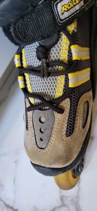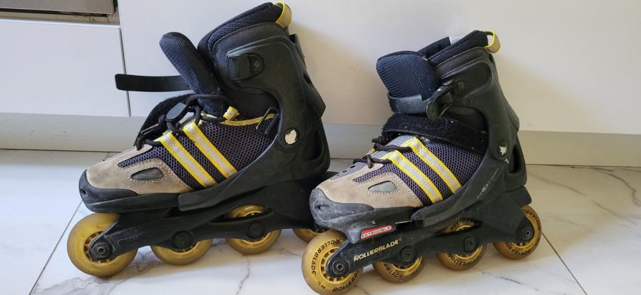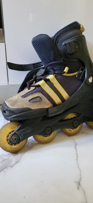 Kvalitetne, udobne, gornji dio koža i prozračan materijal, vrlo udobne za stopalo do 23.5...mogu se podešavati po duljini. Silikonski kotači. Kao novo. Imaju malo ogrebotina inače kao nove.