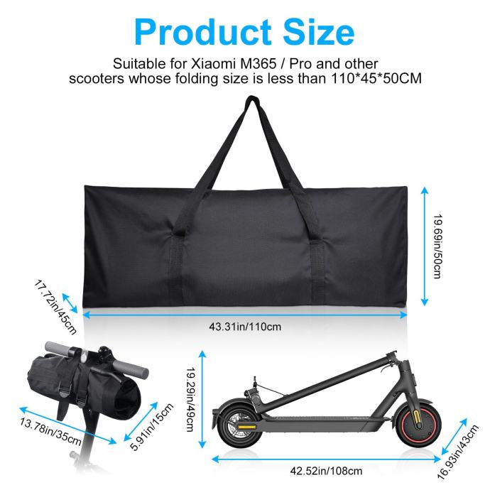 Veličina sklopive torbe za pohranu je 110 x 45 x 50 cm i teži samo 0,50 kg. Pogodna je za gotovo sve električne romobile poput M365/M365 Pro skutera itd.