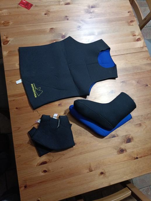 Bezrukavnik, čarape i zaštita koljena. Minimalno korišteno. Debljina 3-5mm.