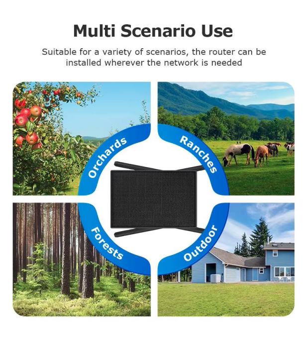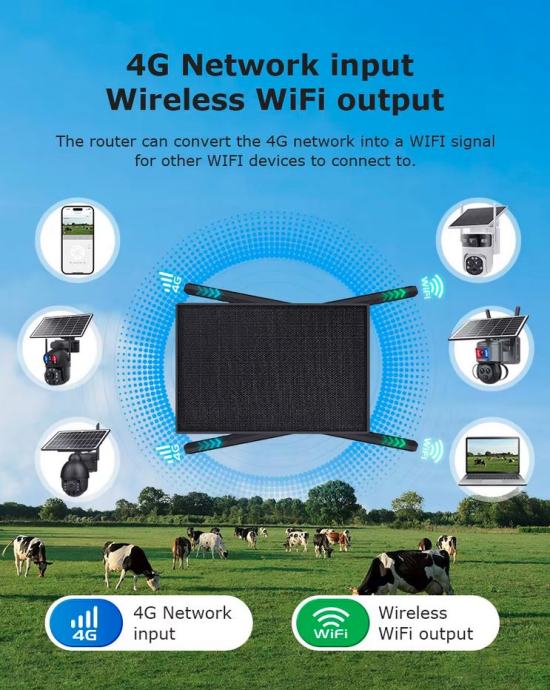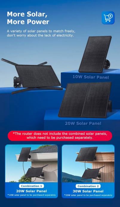 • Učinkovitost solarnog napajanja: Može podržati solarne panele od 10 W, 20 W ili 30 W, ruter se napaja solarnom energijom, eliminirajući potrebu za stalnim punjenjem i pružajući ekološki prihvatljivu energiju.