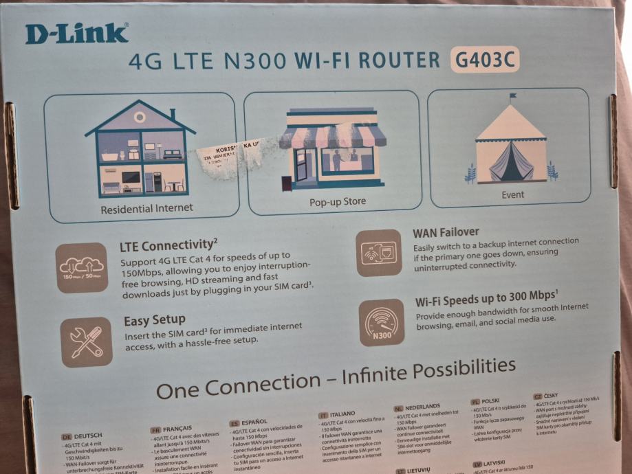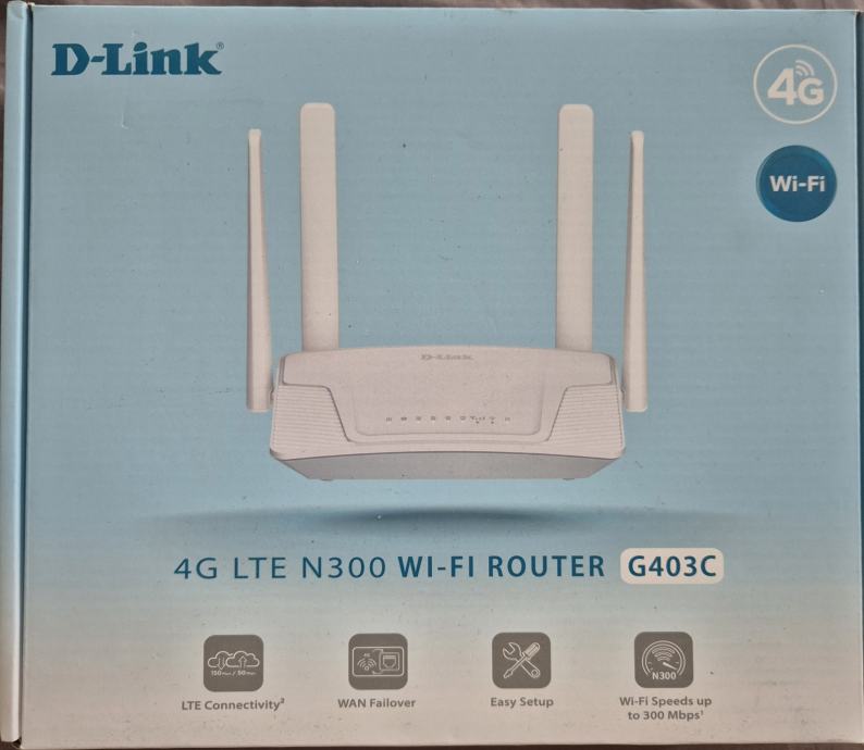 Prodajem potpuno novi D-Link LTE N300 Wi-Fi router G403C koji omogućuje bežični internet putem SIM kartice. Podržava 4G LTE povezivanje s brzinama do 300 Mbps i jednostavno se postavlja umetanjem SIM kartice. Idealan je za kućnu upotrebu, pop-up trgovine ili događaje gdje je potrebna pouzdana internetska veza bez fiksnog priključka.