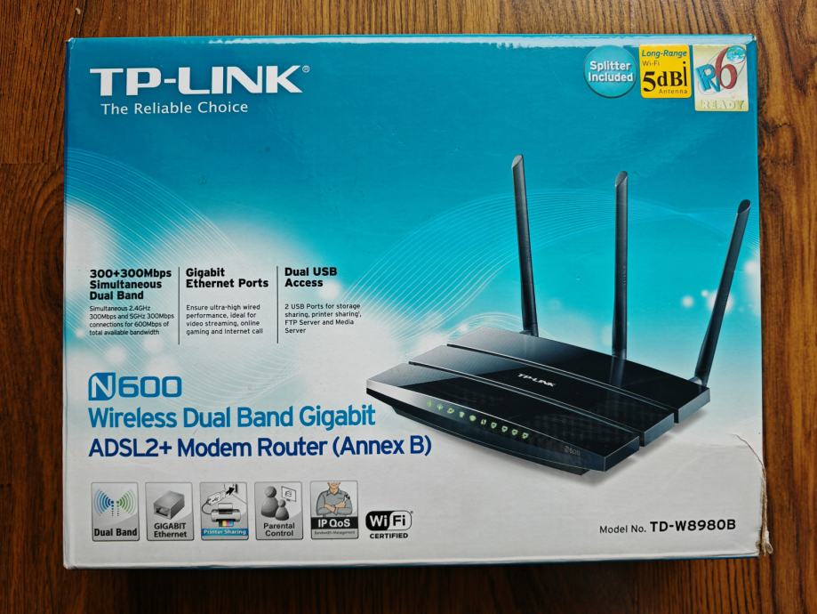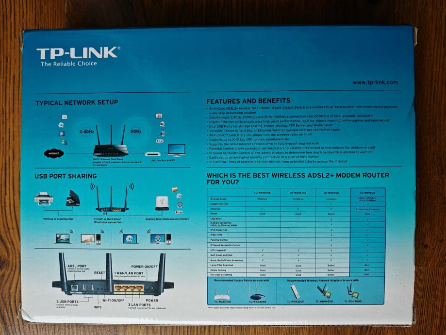 All-in-One Device: ADSL2+ Modem, NAT Router, 4-Gigabit-Port Switch and Wireless N Access Point Simultaneous 2.4GHz 300Mbps and 5GHz 300Mbps connections for 600Mbps of total available bandwidth Versatile Connectivity: ADSL or Ethernet WAN for multiple Internet connection types 2 USB ports for storage sharing, printer sharing, FTP Server and Media Server.