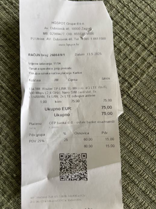 Prodajem TP LINK 4G Router, koristen tri mjeseca dok nije stigla optika. Razlog prodaje je, visak. Cijena u HG Spotu je 75€, ja ga prodajem za 45€. Original racun prilozen.