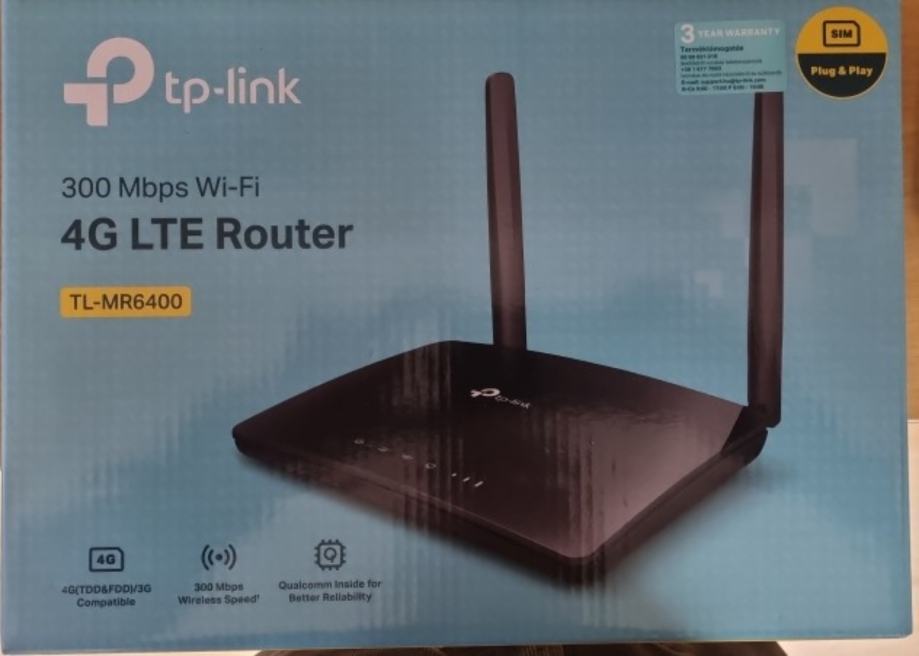 Prodajem TP-Link TL-MR6400, 4G LTE router s podrškom za SIM karticu. Radi na frekvenciji 2.4 GHz i pruža bežičnu brzinu do 300 Mbps. Kompatibilan je s 4G TDD/FDD i 3G mrežama, a ima ugrađeni Qualcomm čip. Plug and Play koncept omogućuje jednostavno postavljanje bez dodatne konfiguracije. Router je crne boje i dolazi s dvije vanjske antene za bolji signal.