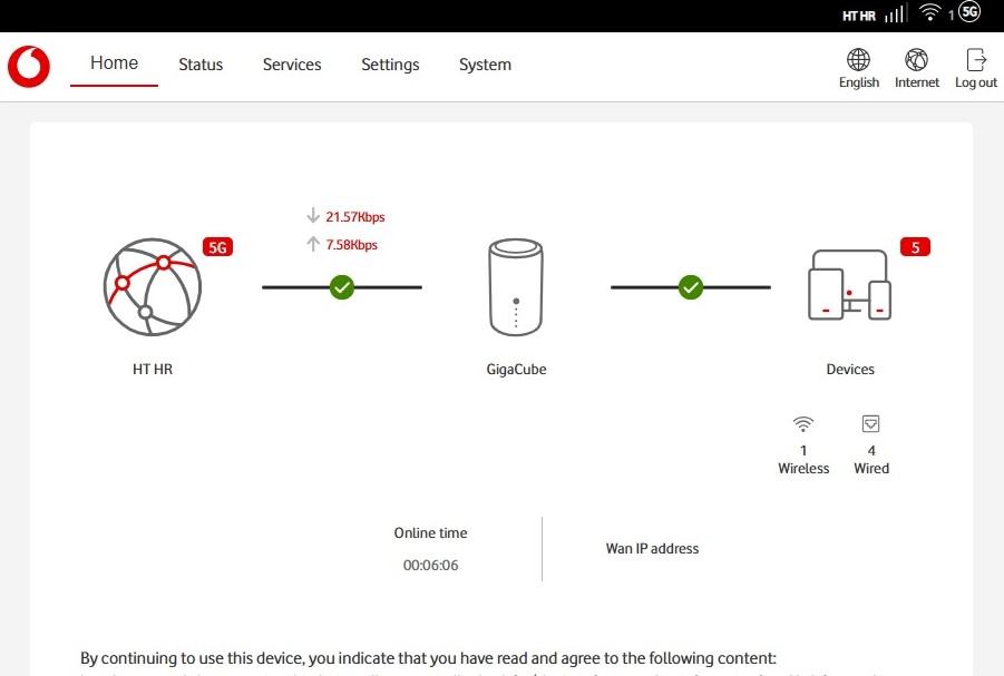 Iako je od vodafonea, otključan je na sve mreže, meni radio na HT-u i u bližoj okolici Varaždina sam imao brzine između 300-400Mbps bez dodatnih vanjskih antena. Također ima i telefonski priključak.