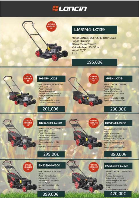 Prodajemo kosilice sa Briggs & Stratton motorima i Loncim motorima. Na svakoj slici imate cijenu i tehničke karakteristike kosilica. Od narudžbe isporuka je dva do tri dana ako šaljemo.