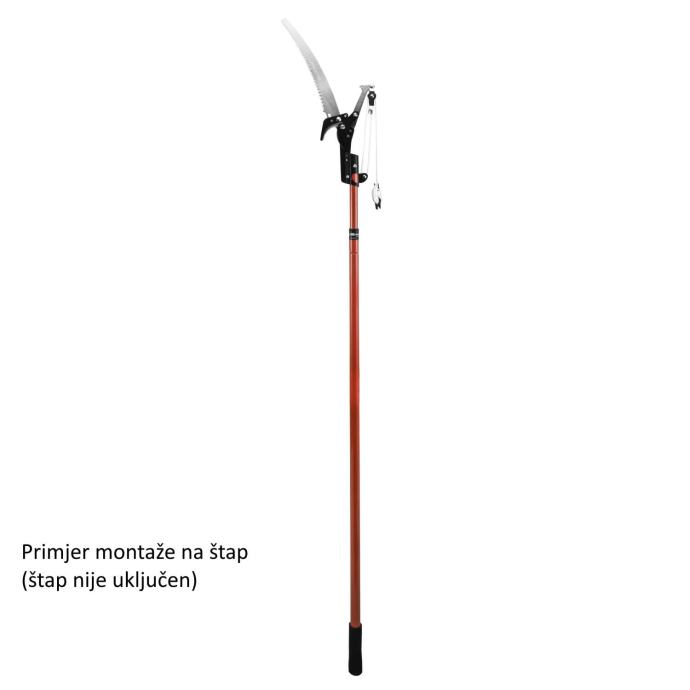 Škare za grane s pilom za orezivanje i rezidbu visokih krošnji. Ova glava se montira na obični ili teleskopski štap promjera cca 24mm (nije uključen).