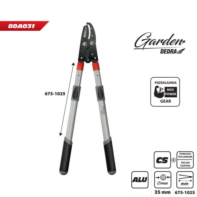 Škare za rezidbu s nakovnjem Dedra 80A031 dizajnirane su za rezanje suhih izdanaka i grana. Teleskopske ruke škara za rezidbu dodatno povećavaju domet i omogućuju vam da dosegnete visoke izbojke ili grane. Čelična oštrica presvučena je teflonskim premazom koji sprječava ljepljenje i štiti oštricu od korozije. Škare imaju reznu oštricu i nazubljeni nakovanj sa zubom, zahvaljujući kojima ni debele grane ne iskliznu tijekom rezanja. Zahvaljujući robusnom prijenosniku, škare za rezidbu mogu bez napora rezati grane promjera do 35 mm. Ručka je izrađena od aluminija s udobnom drškom od dva materijala. .....Šaljemo proizvode u cijelu Hrvatsku dostavnim službama. Izdajemo E-račun tvrtkama. Jamstvo i servis osigurani. Posjetite naš webshop www.vidam.hr