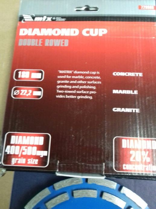 Prodam plavi ili gold disk fi 180 mm.rupa 22 mm.za brušenje betona .podloga i anhidrdnih glazura.Granulacija je br 20.,Pase i na flex, ili rucnu brusilicu.,ili žirafe fi 200 do fi 220 mm.To je original od TRIVARIO masine za brušenje betona.Vrijednost 86€ Cijena za kom 399 kn., ili dogovor.Moguca dostava postom.