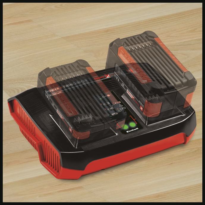 Einhell Power X-Change Twincharger je dvostruki brzi punjač izlazne struje 3 A koji služi punjenju Power X-Change baterije bilo kojeg kapaciteta. Istovremeno može puniti dvije baterije. Radi se o pametnom punjaču jer svoj rad prilagođava stanju baterije kako bi se produljio njezin radni vijek. punjenje se odvija u 6 koraka.