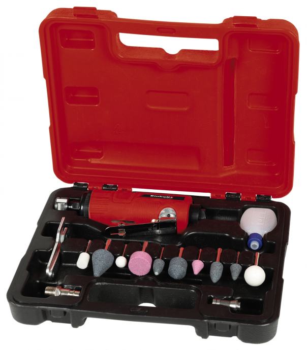 Pneumatska višenamjenska brusilica Einhell TC-PP 220 je visoko precizan alat za brušenje, poliranje, graviranje i dubljenja drva. Gumena ručka omogućuje sigurnu upotrebu. Pneumatska brusilica je pogodna je za rad s jednom rukom. Ručica sigurnosnog prekidača sprječava slučajno pokretanje. Za širok spektar primjene uz uređaj dobivate i 10 kamena za brušenje. Uz proizvod su također uključene 1 mala boca ulja, 1 priključak za brzu spojku crijeva i 2 ključa. Isporučuje se u praktičnom koferu za transport i skladištenje.
