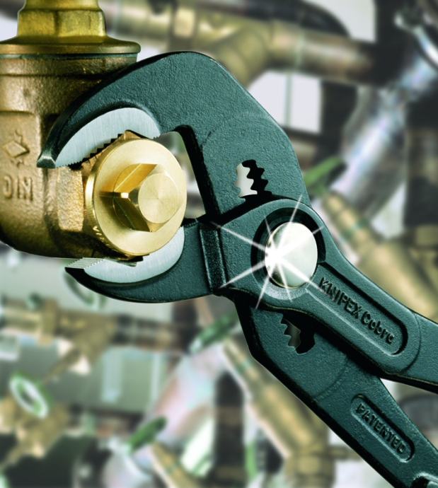 KNIPEX Cobra® – Hightech kliješta za vodene pumpe. Nema više zamornog isprobavanja ispravne širine otvora. Umjesto toga: postaviti gornju polovicu čeljusti na radni komad, pritisnuti gumb i približiti donju čeljust - genijalno jednostavno.