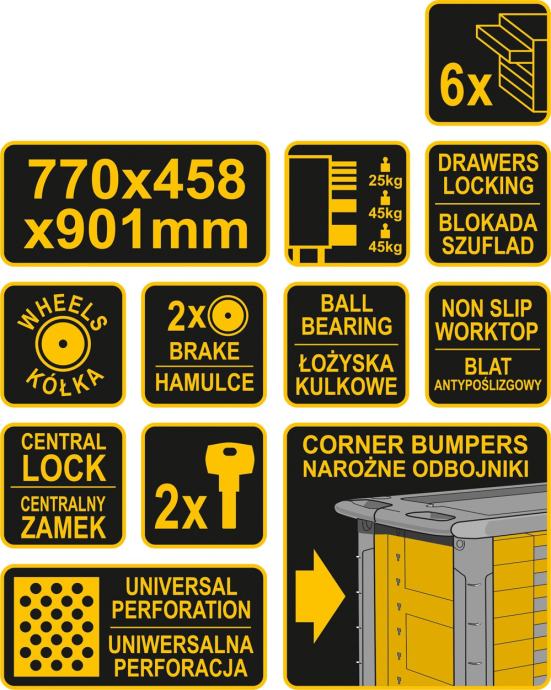 Servisni ormar ima 6 ladica s zatvaranjem pomoću kugličnih ležajeva
