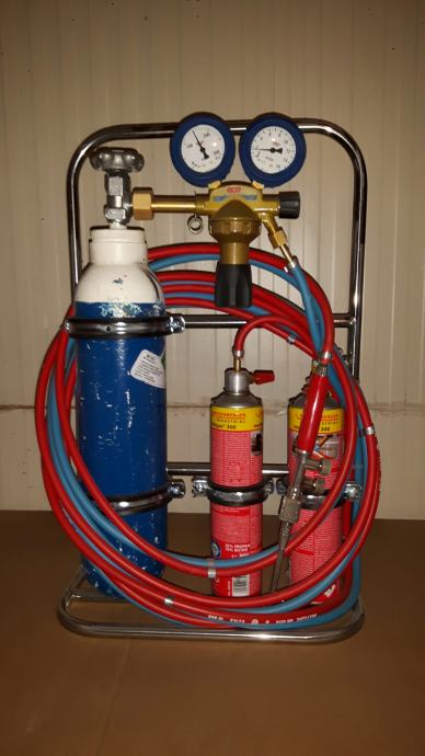 APARAT SE SATOJI OD PROKROM OKVIRA TJ. NOSAČA,BOC ATESTIRANE ZA KISIK 3,3 lit.,MANOMETRA ZA KISIK SA ZAŠTITNIM KAPICAMA,RUKOHVATA GLORR SA NASTAVKOM ZA VARENJE br.1,CRIJEVA ZA PLIN I KISIK DEBLJINE 5 mm,I DUŽINE 5 met.