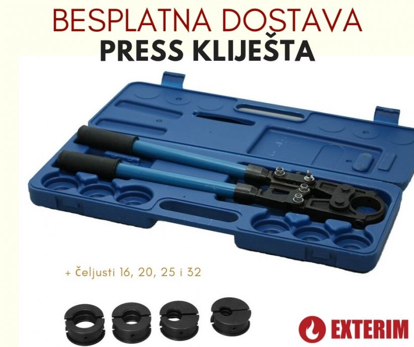 Press kliješta + Press čeljusti (nastavci) dimenzija 16, 20, 25 i 32: 960,86 kuna s PDV-om.