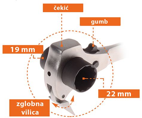 Veličine 19 i 22 u jednom ključu/ Manje alata zbog više funkcija