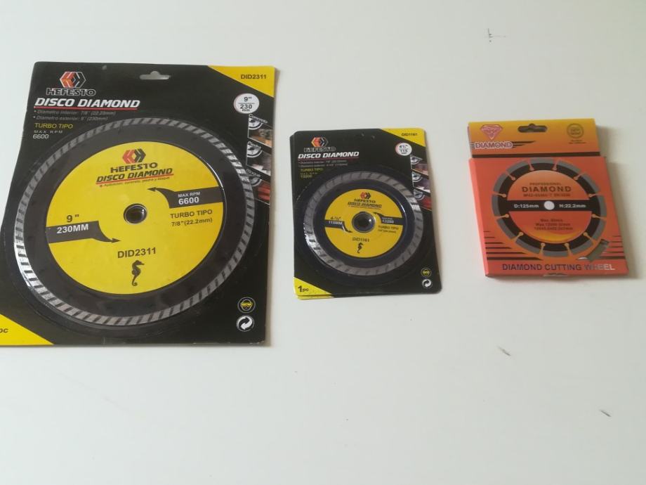 Prodam neke DIAMOND brusne ili rezane ploce za flex ili vodenu masinu,fi 230 za 325 kn, fi 120 za 125 kn i 115 promjer za 99 kn.Ili sve skupa za 540 kn.ili dogovor.Mogu poslati postom.