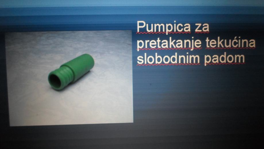 PUMPICA SE KORISTI ZA PRETAKANJE TEKUĆINE. PREDUVJET JE DA SE PRETAČE IZ POSUDE KOJA JE NA VIŠEM NIVOU OD POSUDE U KOJU SE PRETAČE.TE NIJE POTREBNO DA U CIJEVČICU USTIMA UPUHUJETE ILI USIŠETE TEKUĆINU DA BI PRIRODNIM PADOM POTEKLA POTEKLA .NA TU CIJEVČICU NAVUČETE ODGOVARAJUĆU PUMPICU ,ONAJ KRAJ CIJEVČICE NA KOJOJ JE PUMPICA , ZARONITE U POSUDU SA TEKUĆINOM NA VIŠEM NIVOU I ENERGIČNO MIČETE GORE-DOLE JEDNO 15 CM TOLIKO PUTA DOK NE POTEČE TEKUĆINA .