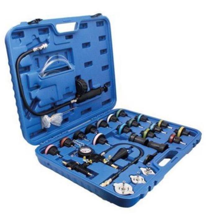 Prodajem novi set alata sa pumpom u koferu za kontrolu propusnosti rasladnog sustava vozila. Sastoji se od ručne pupe s manometrom , termometrom i različitih adaptera za čep hladnjaka. Otkriva puknuće glave ili kvar brtve glave, propuštanje hladnjaka i sl.