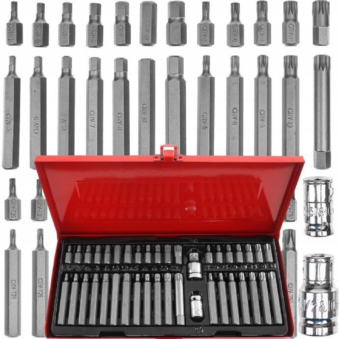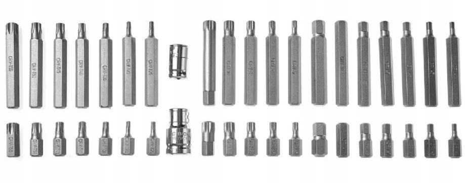 Profesionalni set bitova za odvrtanje specijalnih vijaka kao što su imbus, torx, spline. Raznolikost nastava omogućuje obavljanje mnogih poslova u specijaliziranim mehaničarskim i autoservisima. Vrhovi su dvije duljine: 30 i 75 mm, montirani u šesterokutni držač od 10 mm, prilagođeni za rad sa čegrtaljkom od 1/2' i 3/8'. Set je izrađen od najkvalitetnijeg krom-vanadij čelika.
