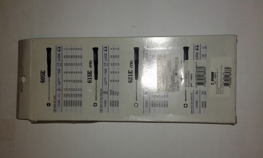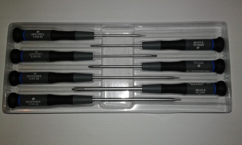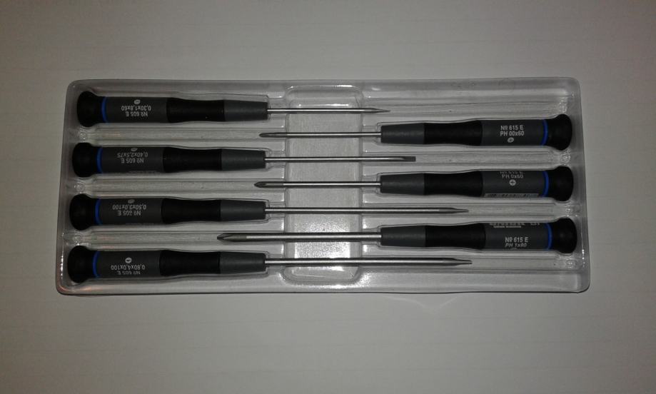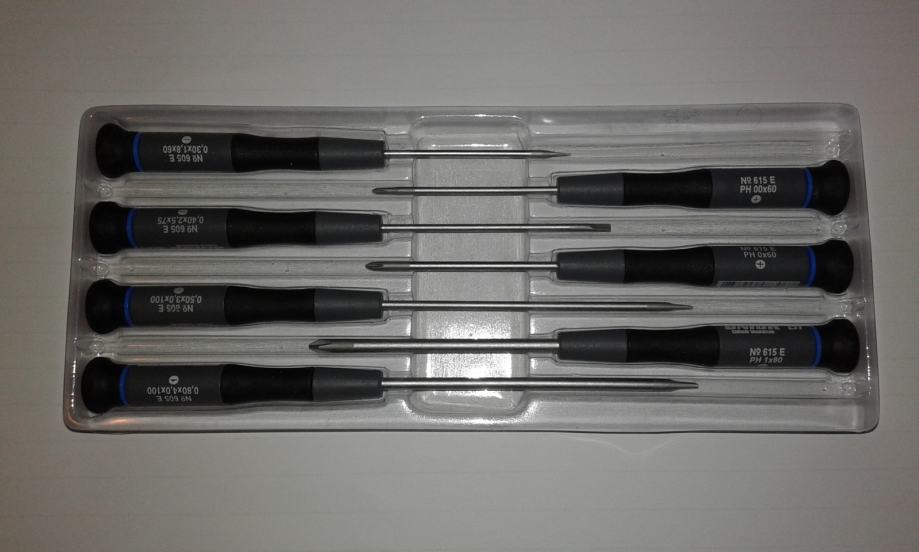 ---Izvijači za preciznu elektroniku; ergonomski oblik ručke iz dvokomponentnog materijala; vrteća kapica; špica iz krom vanadija; mat kromirano;